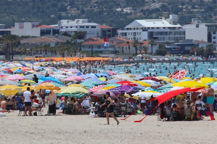 Nüfusu 1 milyonu aşan ilçede vatandaşlar denizin ve kumun tadını çıkartıyor. İlçenin en ünlü plajlarından Ilıca Plajı'nda yaşanan yoğunluk havadan görüntülendi.