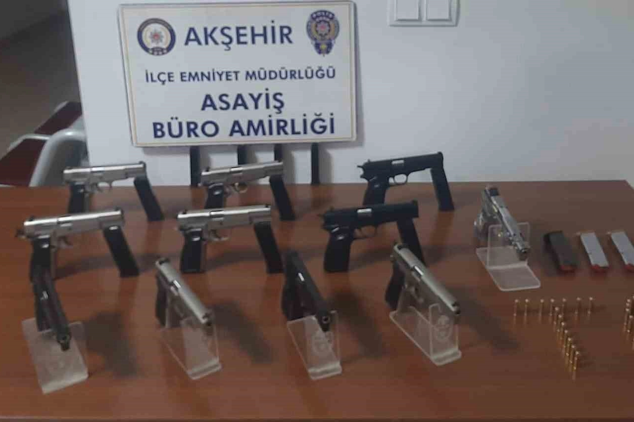 Akşehir İlçe Emniyet Müdürlüğü Asayiş Büro Amirliği ekipleri yaptığı istihbarı çalışmalar çerçevesinde bir araç ile silah kaçakçılığı yapıldığını tespit etti. Takibe başlayan asayiş ekipleri aracı D-300 Kara yolu üzeri uygulama noktasında durdurdu. Araçta bulunan K.P. ile F.S. isimli şahısları gözaltına alan ekipler araç ile şüphelileri detaylı arama yapmak üzere emniyet müdürlüğü bahçesine getirdi. Akşehir Cumhuriyet Başsavcılığından alınan arama kararı ile aracı detaylı bir şekilde arayan ekipler 11 adet tabanca, 13 adet tabanca şarjörü ile 33 adet tabanca mermisi ele geçirdi. Şüpheliler K.P. ile F.S. emniyetteki işlemlerinin tamamlanmasının ardından adliyeye sevk edildi. Şüphelilerden K.P. mahkemece tutuklanarak Akşehir Cezaevine gönderilirken, F.S. adli kontrol şartıyla tutuksuz yargılanmak üzere serbest bırakıldı.