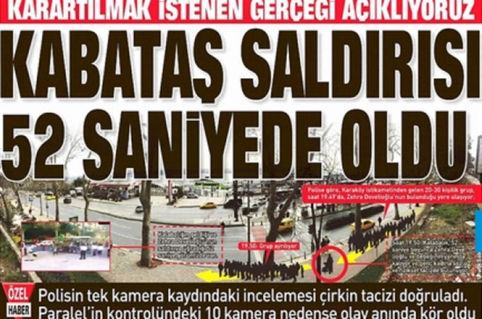 Bugünkü Sabah gazetesinin manşeti, "Kabataş saldırısı 52 saniyede oldu" şeklinde. "Özel Haber" anonsuyla duyurulan manşetin spotunda ise, "Polisin tek kamera kaydındaki incelemesi çirkin tacizi doğruladı. Paralel'in kontrolündeki 10 kamera nedense olay anında kör oldu" deniyor.