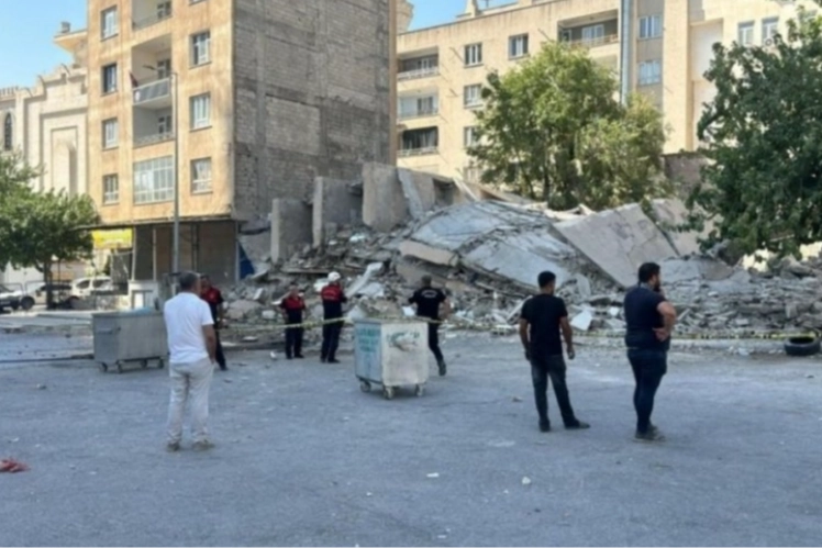 Şanlıurfa'da Kahramanmaraş merkezli depremlerde ağır hasar alan binaların yıkımları sürüyor. Haliliye ilçesine bağlı Bamyasuyu Mahallesi'ndeki ağır hasarlı 4 katlı bina, iş makinesiyle yıkılırken aniden çöktü. Çökme sırasında üzerine moloz düşen iş makinesi yan yattı. Kazada, operatör yara almadan kurtuldu.