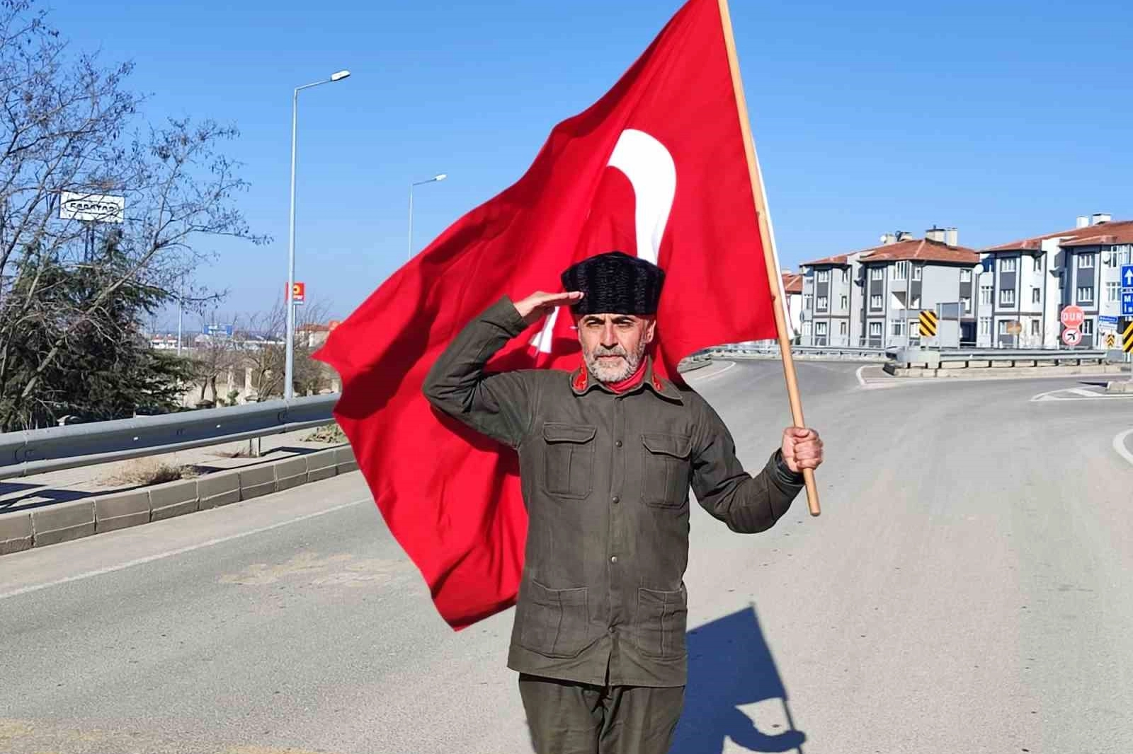 Çanakkale Zaferi’nin 110. yılında, şehitler anısına, Türk bayrağı ile birlikte yürüyen Tokat Onbeşli Torunları Derneği Başkanı ve Çanakkale Savaşı gazisi torunu Gümüş, yürüyüşünün 6. gününde Keşan’a ulaştı. İlçe sınırlarına giren Saffet Gümüş, ilçe girişindeki Yenimuhacir Belde Belediye Başkanı Tamer Kıral tarafından karşılandı. Gümüş, kendisini karşılayan Kıral’a Türk bayrağı hediye etti.