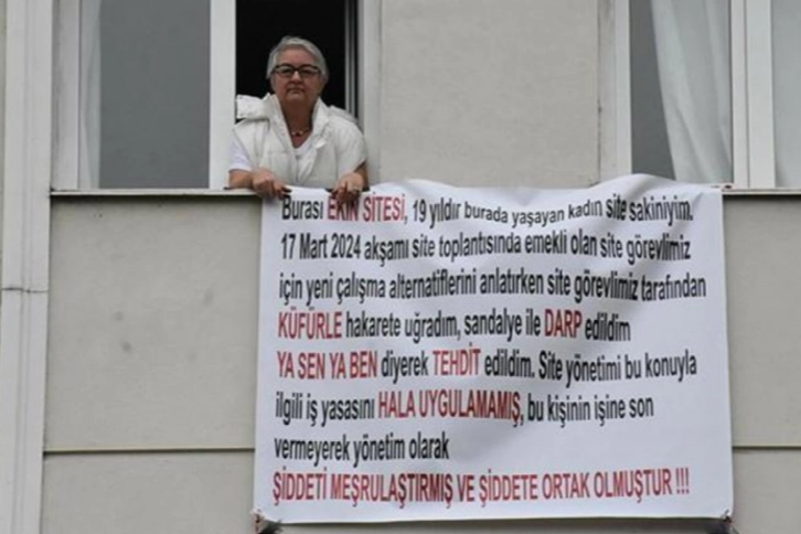 Öte yandan sesini duyurmak isteyen Aysun B., oturduğu daireye 'Burası, Ekin Sitesi. 19 yıldır burada yaşayan kadın site sakiniyim. 17 Mart 2024 akşamı site toplantısında emekli olan site görevlimiz için yeni çalışma alternatiflerini anlatırken, site görevlimiz tarafından küfürle hakarete uğradım, sandalye ile darbedildim. 'Ya sen ya ben' diyerek tehdit edildim. Site yönetimi, bu konuyla ilgili İş Yasası'nı halen uygulamamış. Site yönetimi, bu kişinin işine son vermeyerek şiddeti meşrulaştırmış, ortak olmuştur' yazılı pankart astı.