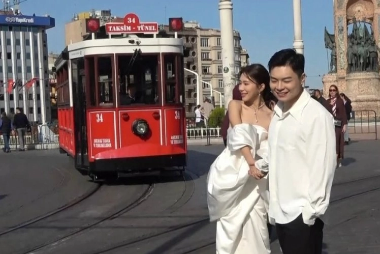 Yerli ve yabancı turistlerin uğrak noktası olan Taksim Meydanı, bu sefer Çinli gelin ve damadı ağırladı. Çin'den evlenmek için İstanbul'a gelen çift, fotoğraf çekimi için Taksim Meydanı ve İstiklal Caddesi'ni tercih etti.
