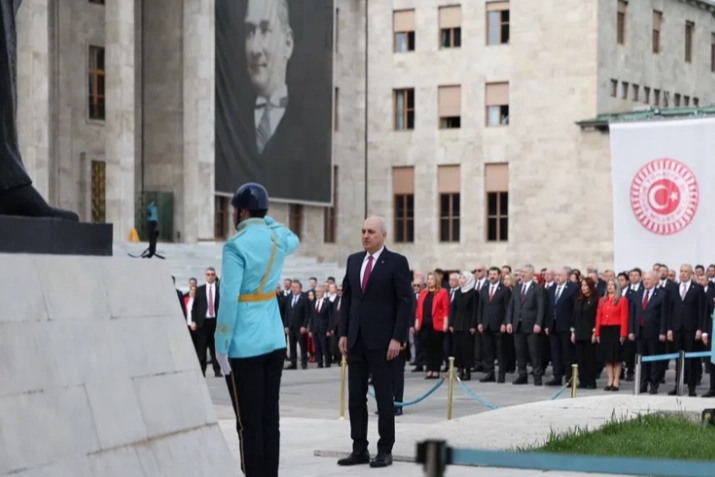 TBMM’deki ilk tören, Atatürk heykeline çelenk konulmasıyla başladı. Törene TBMM Başkanı Numan Kurtulmuş, TBMM başkanvekilleri, Başkanlık Divanı üyeleri, grup başkanvekilleri ve milletvekilleri katıldı. TBMM Başkanı Kurtulmuş'un çelenk koymasının ardından saygı duruşunda bulunularak, İstiklal Marşı okundu. Meclis Başkanı Kurtulmuş ve milletvekilleri ardından Anıtkabir’e gitti.