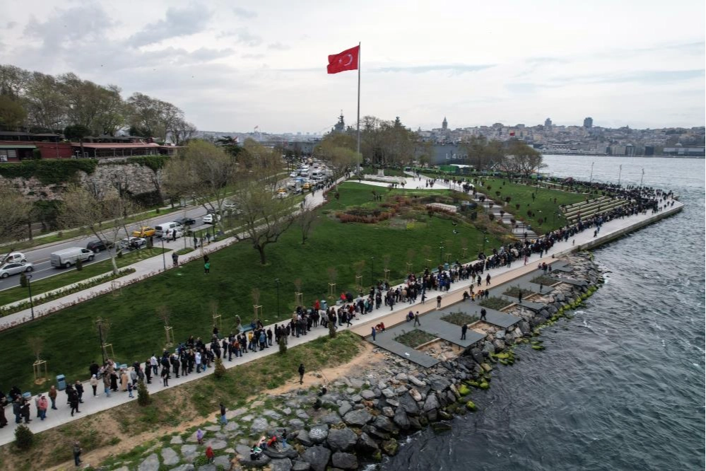 Genç yaşlı çocuk demeden binlerce kişi Sarayburnu Limanı'na demirleyen TCG Anadolu'yu görmek için Sarayburnu'na akın etti. Rüzgarlı havaya aldanmadan uzun bekleme sürelerini göze alan vatandaşlar sahil hattında hem balık tuttu hem sıra beklediler. O anlar havadan görüntülendi. Sahil boyunca uzayan kalabalığın en net görüntüsü drona yansıdı. TCG Anadolu, 17-23 Nisan tarihleri arasında İstanbul'da ziyaret edilebilecek.