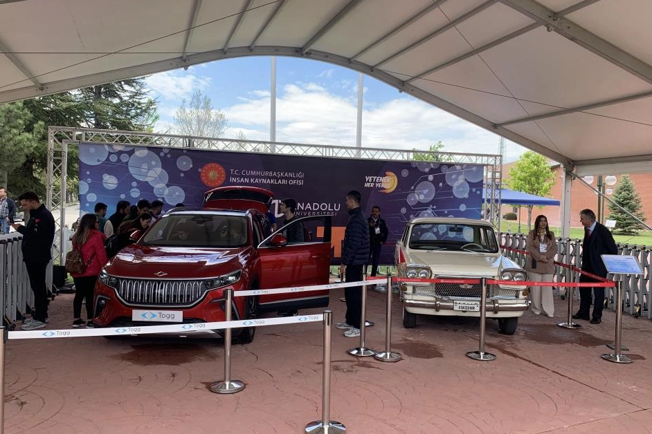 Cumhurbaşkanlığı İnsan Kaynakları Ofisi (CBİKO) koordinasyonunda ve Anadolu Üniversitesi’nin ev sahipliğinde gerçekleşen İç Anadolu Kariyer Fuarı bugün itibariyle başladı. Yunus Emre Kampüsü’nde gerçekleşen fuarda çeşitli markaların stantları ziyaretçilerini bekliyor. İç Anadolu Kariyer Fuarı etkinlikleri kapsamında 1961 yılında Eskişehir Demiryolu Fabrikası’nda (TÜLOMSAŞ) üretilen Devrim otomobili ve son zamanlarda isminden sıkça söz ettiren TOGG, Anadolu Üniversitesi İletişim Bilimleri Fakültesi önüne yan yana sergilendi. Özellikle üniversite öğrencilerinin büyük bir ilgi ile incelenen iki yerli araç için, 'gurur verici' olduğu söylendi. Türk öğrenciler gibi ülkelerinden Türkiye’ye eğitim almaya gelen öğrenciler, TOGG’un T10X modelini yakından incelme fırsatı bulup için donanımlarını kısa da olsa test etti. Öğrencilerin geneli aracı beklediklerinden daha lüks bulduklarını belirtirken, iki araçla da gurur duyduklarını ifade ettiler. Türkiye’de eğitim gören Somali vatandaşı öğrenci Abdülsamed Muhamed Omar, TOGG’un içini uçak kokpitine benzetirken şöyle konuştu: “Gerçekten insana farklı hissettiriyor. Aracın içi çok geniş, adeta üst düzey bir uçak kokpiti gibi. İllerde böyle bir araca sahip olmak isterim çünkü doğa dostu olduğunu düşünüyorum. Böyle ileri teknoloji ürünü bir araca sahip olmak isterim. Konfor açısından beklediğimin çok üzerinde, çok rahat içi. Devrim aracını da inceledim gerçekten yol kat edilmiş.” “Bu iki aracı yan yana görmek gurur verici” Yunus Emre Kampüsü’nde iki yerli aracı inceleyen Tuğbanur İnce, “Buraya gelmek çok güzel bir duygu. Daha önce de Devrim arabasını müzede görmüştüm, TOGG’uda incelemiştim. Burada arkadaşlarım araçlara yoğun ilgi gösterdiği için ben de tekrar gezmek istedim. Bir Türk olarak bu iki aracı yan yana görmek gurur verici” dedi. Daha sonra Enerji ve Tabii Kaynaklar Bakanı Fatih Dönmez, Anadolu Üniversitesi Rektörü Prof. Dr. Fuat Erdal ve paydaş üniversitelerin rektörleri iki yerli aracı ziyaret edip hatıra fotoğrafı çekindiler.