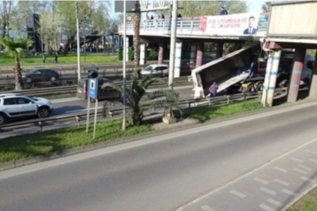 Trabzon'da TIR'ın taşıdığı kamyonun kasası, otoyol köprüsüne çarparak sıkıştı. Kazada, köprüde hasar oluştu.