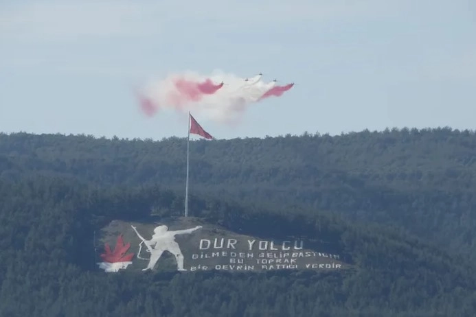 Çanakkale Boğazı ve Kilitbahir köyü dağında bulunan 'Dur Yolcu' yazısı üzerinde kalp çizen uçaklar vatandaşlardan büyük alkış aldı. Türk Yıldızları, 18 Mart Şehitleri Anma ve Çanakkale Deniz Zaferi'nin 110'uncu yıl dönümü olan Salı günü Şehitler Abidesinde gösteri uçuşu gerçekleştirecek.