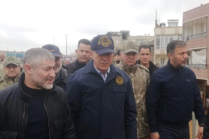 İçişleri Bakanı Süleyman Soylu, Milli Savunma Bakanı Hulusi Akar ve Hazine ve Maliye Bakanı Nureddin Nebati, selin vurduğu Şanlıurfa’da incelemelerde bulundu. İncelemeler sonrası bir açıklama yapan Bakan Akar, ilk günden itibaren vatandaşın yaralarını sarmak için sahada olduklarını belirtti. İçişleri Bakanı Süleyman Soylu, Milli Savunma Bakanı Hulusi Akar ve Hazine ve Maliye Bakanı Nureddin Nebati, Şanlıurfa’da selin vurduğu merkez Eyyübiye ilçesine bağlı Akabe Mahallesi'nde incelemelerde bulundu. Üç bakan Karakoyun Deresi çevresini gezerek, bilgi aldı. Bakan Akar, burada yaptığı açıklamada ilk günden itibaren sahada olduklarını söyledi. Türkiye’nin daha önce de bu tür sınavlar verdiğini dile getiren Bakan Akar, ”Arkadaşlar son zamanlarda maalesef bir taraftan deprem, bir taraftan sel felaketiyle karşı karşıyayız. Fakat burada sevindirici olan şey devletimiz ilk andan itibaren milletimizle beraber omur omuza. Herkes elinden gelen gayreti göstermekte ve milletimizin yaralarını sarmak için gerçekten gece gündüz demeden mücadeleyi sürdürmekteyiz. Sayın Cumhurbaşkanımız başta olmak üzere bütün bakanlarımız, bütün ilgili personelimiz, valilerimiz, kaymakamlarımız, belediyelerimiz bu konuda ayakta. Milletimizle beraber inşallah bu yaraları saracağız. Karamsarlık yok, kötümserlik yok. Bizim milletimiz buna benzer konularda daha önce imtihanını vermiş bir millet, sınavını vermiş bir millet. Bunların üstesinden geldik. İnşallah bunun da üstesinden geleceğiz. Bu konuda hep beraber çalışmamızı sürdürüyoruz. İnşallah en kısa zamanda bu yaraları saracağız. İlk andan itibaren bildiğiniz gibi 6 Şubat'ta deprem sırasında ve bu sel sırasında devletimizin bütün kurumlarıyla birlikte Türk Silahlı Kuvvetleri, Mehmetçik seferber olmuştur. Sadece burada arazide olan sahadaki unsurlarımız değil, bütün imkanlarımızı seferber ettik. Vatandaşımızın yanındayız. Mehmetçik vatandaşımızın yanına koştu ve dolayısıyla buradaki mücadelemizi sürdürüyoruz. İnşallah bu mücadeleden de devlet olarak, millet olarak, Silahlı Kuvvetler olarak alnımızın akıyla çıkacağız. Hepimizin başı sağ olsun” diye konuştu.