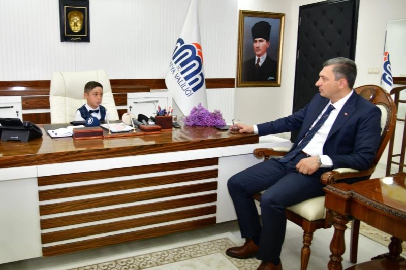 Deprem bölgesi Malatya’da 23 Nisan Ulusal Egemenlik ve Çocuk Bayramı etkinlikleri kapsamında çocuklar protokol makamlarına oturdu. Malatya Valiliği koltuğuna ise Şehit Kenan Çetin İmam Hatip Orta Okulu 5. sınıf öğrencisi Tarık Boztepe oturdu. Makamı Vali Hulusi Şahin’den devralan çocuk Vali Tarık Boztepe, 6 Şubat’ta yaşanan asrın felaketinin 11 ili derinden etkilediğini söyleyerek, “Malatya’yı daha da yenileyeceğiz, yıkılan binaların yerine daha sağlam binalar yapacağız” dedi. Valilik Özel Kalem Müdürünü de yanına çağıran çocuk vali, verdiği talimatla da bundan sonra daha sağlam zeminlere binaların yapılmasını ve inşatlarında çok demir kullanılmasını istedi. Çocuk vali, ayrıca depremzedeler için nakit yardım ve barınma sorununun giderilmesi talimatını da iletti. Acil yıkılacak yapıların yüzde 98’i tamamlandı Temsili valilik makamına oturan Boztepe’ye teşekkür eden Malatya Valisi Hulusi Şahin ise kentteki son enkaz kaldırılmaları ile ilgili son durumu paylaştı. Genç ve dinamik bir valinin görevi devralmasının memnuniyet verdiğini ifade eden Şahin, “Ama bu makamlara gelmen için bayağı zamanın var. İnşallah ileride buralara gelirsin. Asaleten valilik görevine geldiğin günlerde artık Malatya ve Türkiye’nin yapı stoku son derece güçlü olur ve depremlerden etkilenmeyen, yıkılmayan binaların olduğu şehirlerde yöneticilik yaparsın, buna inanıyorum. Bizler de şu andaki yöneticiler olarak sizlerin zamanı gelinceye kadar sizlere daha güvenli şehirler oluşturmak için çalışacağız” şeklinde konuştu. Malatya’da deprem sonrası yıkılan ve acil yıkılacak binaların enkazının kaldırılmasında yüzde 98’lik bir oranın tamamlandığını ifade eden Şahin, ağır hasarlı binaların ise askı sürecinin tamamlanması ile buraların da hızla yıkılacağını söyledi. Kentte okullarda da 20 okulun yıkıldığını ve bunların yerine de yeni okulların yapılacağını ifade eden Şahin, ağır hasarlı binalarda ise prefabrik dersliklerde eğitimin sürdüğünü belirtti. Vali Şahin, 2 Mayıs itibarıyla da şu anda 3’te 1’lik doluluk oranına sahip okullarda, öğretmen ve öğrencilerin de gelmesi ile doluluğun artacağını söyledi. Program sonunda Vali Şahin, görevini temsili olarak devralan Tarık Boztepe ve öğretmeni İsmail Altun ile okul müdürü Elif İlaslan'a hediye takdim etti.