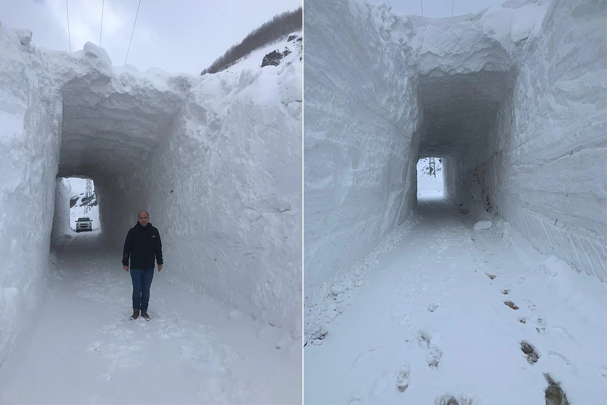 Yaklaşık 10 saat süren çalışma sonrasında açılan 20 metre uzunluk, 10 metre yüksekliğindeki kardan tünel yardımı ile mahsur kalan araçlar köye ulaştırıldı.