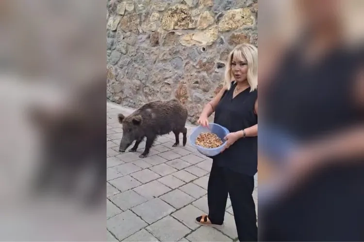 Bodrum'da yerleşim yerlerine inen yaban domuzları bu kez ünlü sanatçı Safiye Soyman’ın kapısındaydı. Korkusuzca domuza ceviz ikram eden Soyman, hayvanın ani hareketiyle neye uğradığını şaşırdı. O anlar sosyal medyada viral oldu!