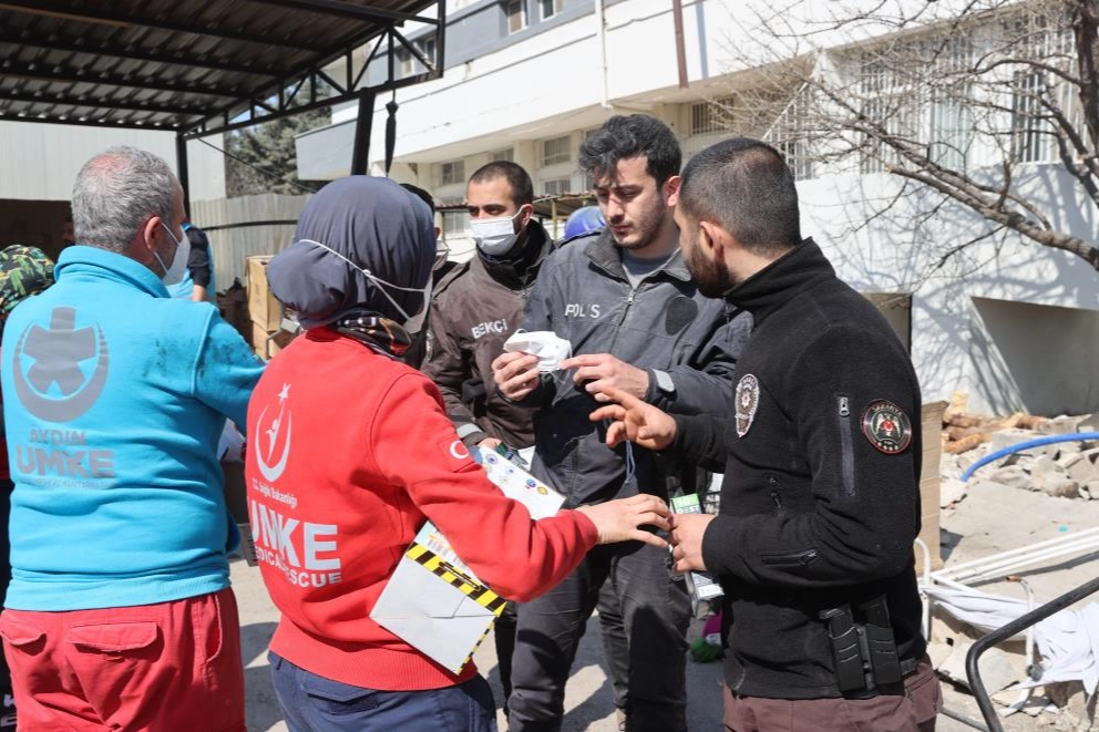 Sağlık Bakanlığı ekipleri, Hatay'da enkaz kaldırma çalışmalarına katılan görevlilere maske dağıttı. Görevliler, kesinlikle maske takılmasını önerdi.
