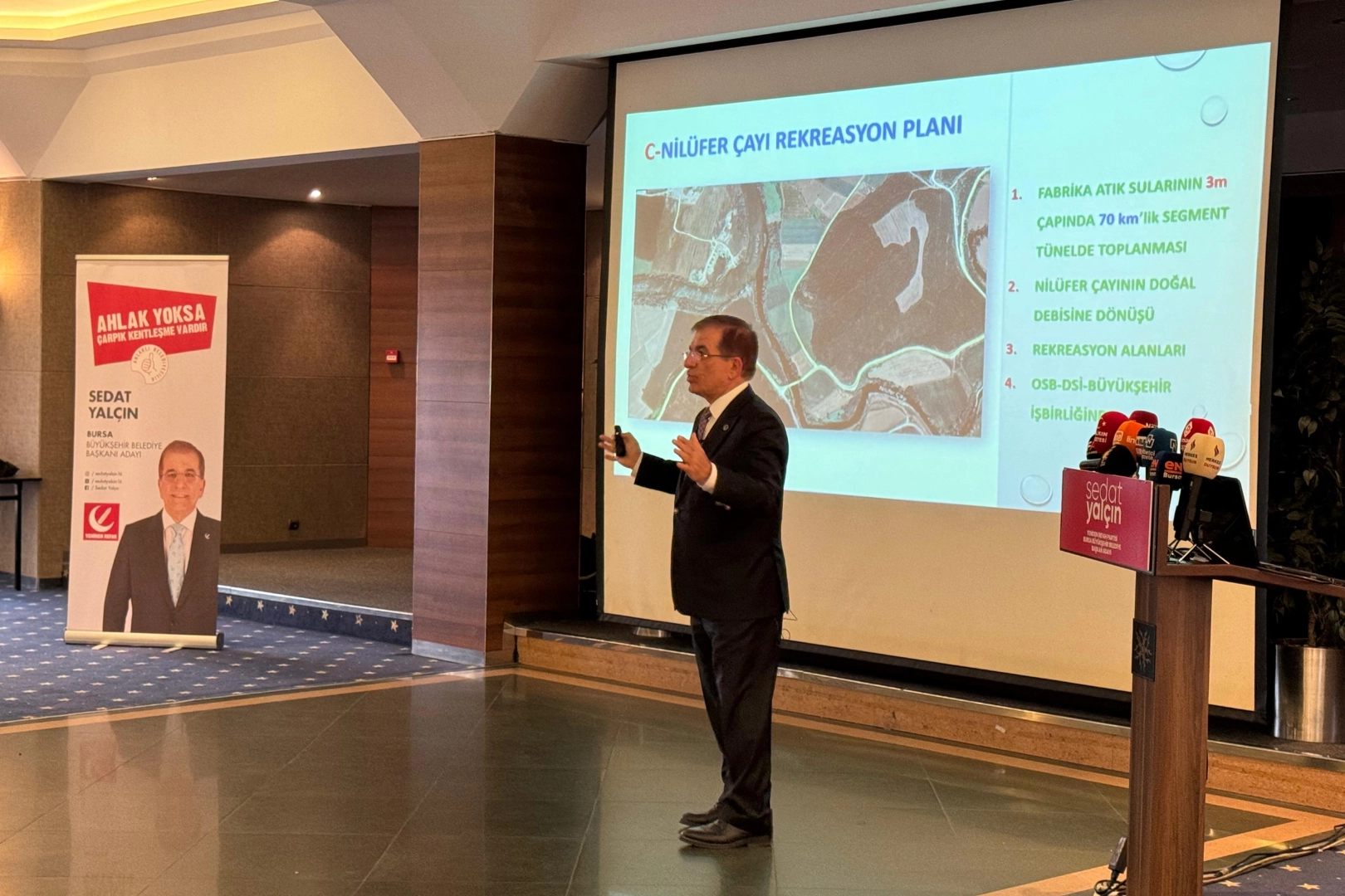 NİLÜFER ÇAYINI KURTARMAK İÇİN BÜYÜK MUTABAKAT ÇAĞRISI Çevre ve sürdürülebilirlik alanında yaptığı açıklamaların ardından projelerinden bahseden Sedat Yalçın; arıtma tesisleri ve filtre kullanımındaki yeni çalışmalarını anlatarak, “Nilüfer Çayı’nda, fabrika atıklarının 3 mt çapında ve 70 km uzunluğunda segment tünel içinde toplanmasını planlıyoruz. Bu sayede Nilüfer Çayı’nın doğal debisine dönüşünü sağlayarak vatandaşlarımızın nefes alabileceği rekreasyon alanları yapacağız” diye konuştu. Bu projeyi Dünya Bankası kaynaklarıyla, mevcut OSB ‘ler ve DSİ ile işbirliği halinde gerçekleştireceğiz. Hali hazırda sanayicilerimiz ödediği atık bedelleri bu projenin finansmanını oluşturacak.