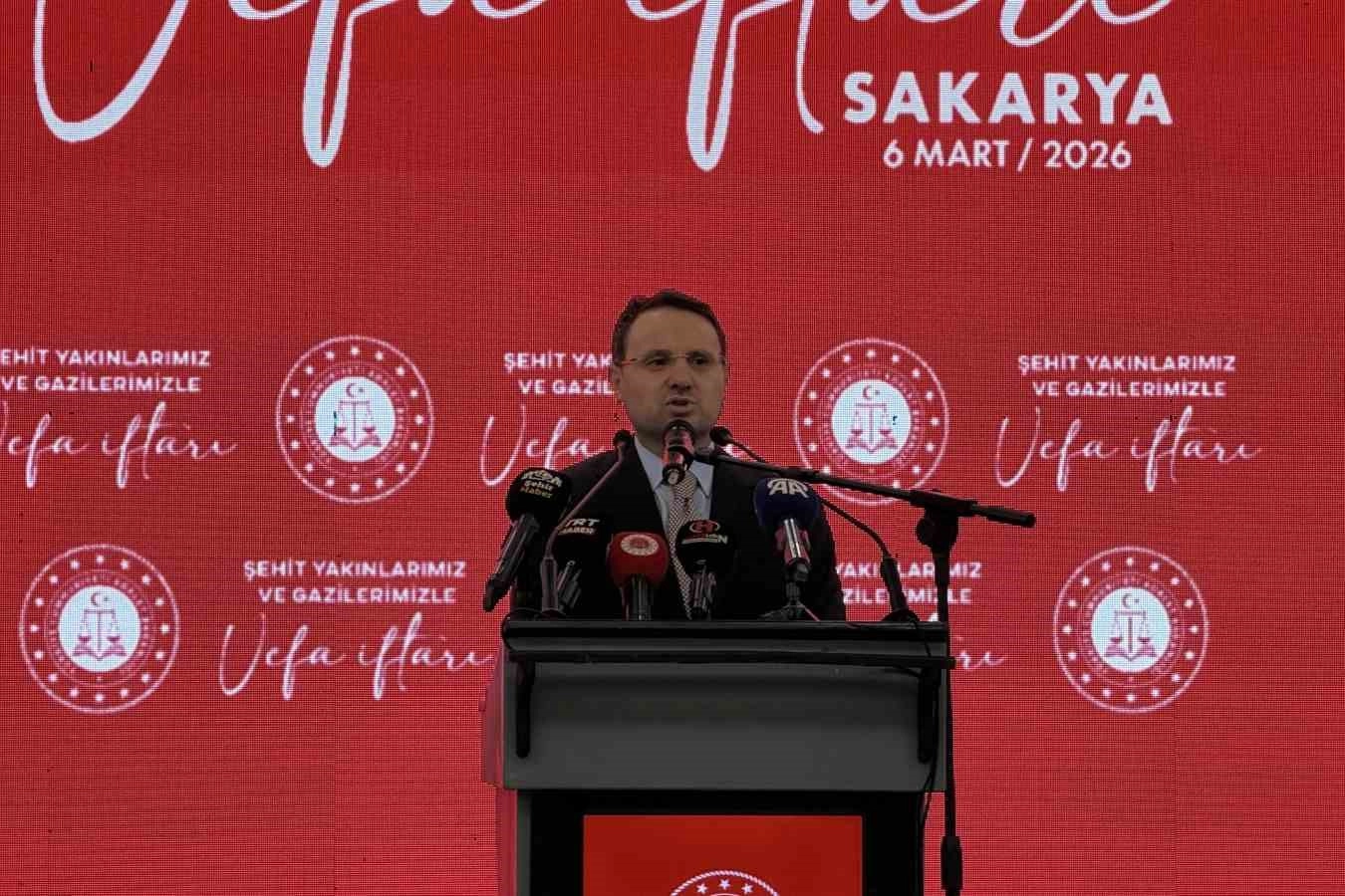 İftar programında konuşan Adalet Bakanı Akın Gürlek, "Ramazan-ı Şerif’in huzurunda sizlerle birlikte bir araya gelmenin onurunu ve mutluluğunu yaşıyorum. Öncelikli olarak sizinle aynı sofrayı paylaştığım için hepinize ayrı ayrı teşekkür ediyorum. Vatanımızın bağımsızlığı, milletimizin huzuru ve devletimizin bekası için canlarını feda eden aziz şehitlerimizi rahmet, minnet ve şükranla yad ediyorum. Kahraman gazilerimize milletimiz adına şükranlarımı sunuyorum, sağlık ve afiyet diliyorum. Bugün Sakarya ziyareti öğle vakitlerinde başladı. Önce adliyemizi ziyaret ettik, daha sonra Valimizi ziyaret ettik, Ulaştırma Bakanlığımızın gerçekten yerli ve milli projesi hızlı tren projesine katılmak bize nasip oldu. Sakarya huzurun, kardeşliğin şehri. Bu şehirde yaşadığınız için, kardeşçe huzur içinde yaşadığınız için şanslısınız. Ben size, hepinize ayrı ayrı teşekkür ediyorum. Şehitlerimiz bu milletin istiklalinin mühürleridir. Gazilerimiz ise fedakarlığın, cesaretin yaşayan nişaneleridir. Siz kıymetli şehit ailelerimiz ve gazilerimiz milletimizin baş tacısınız. Sizler fedakarlık gösterdiğiniz için biz bugün buradayız, rahat bir şekilde iftar sofralarında bir araya geliyoruz. Burada kurduğumuz iftar sofrası yalnızca bir yemek sofrası değil, aynı zamanda dayanışmanın, kardeşliğin, vefanın, birlikteliğin sofrası" diye konuştu.