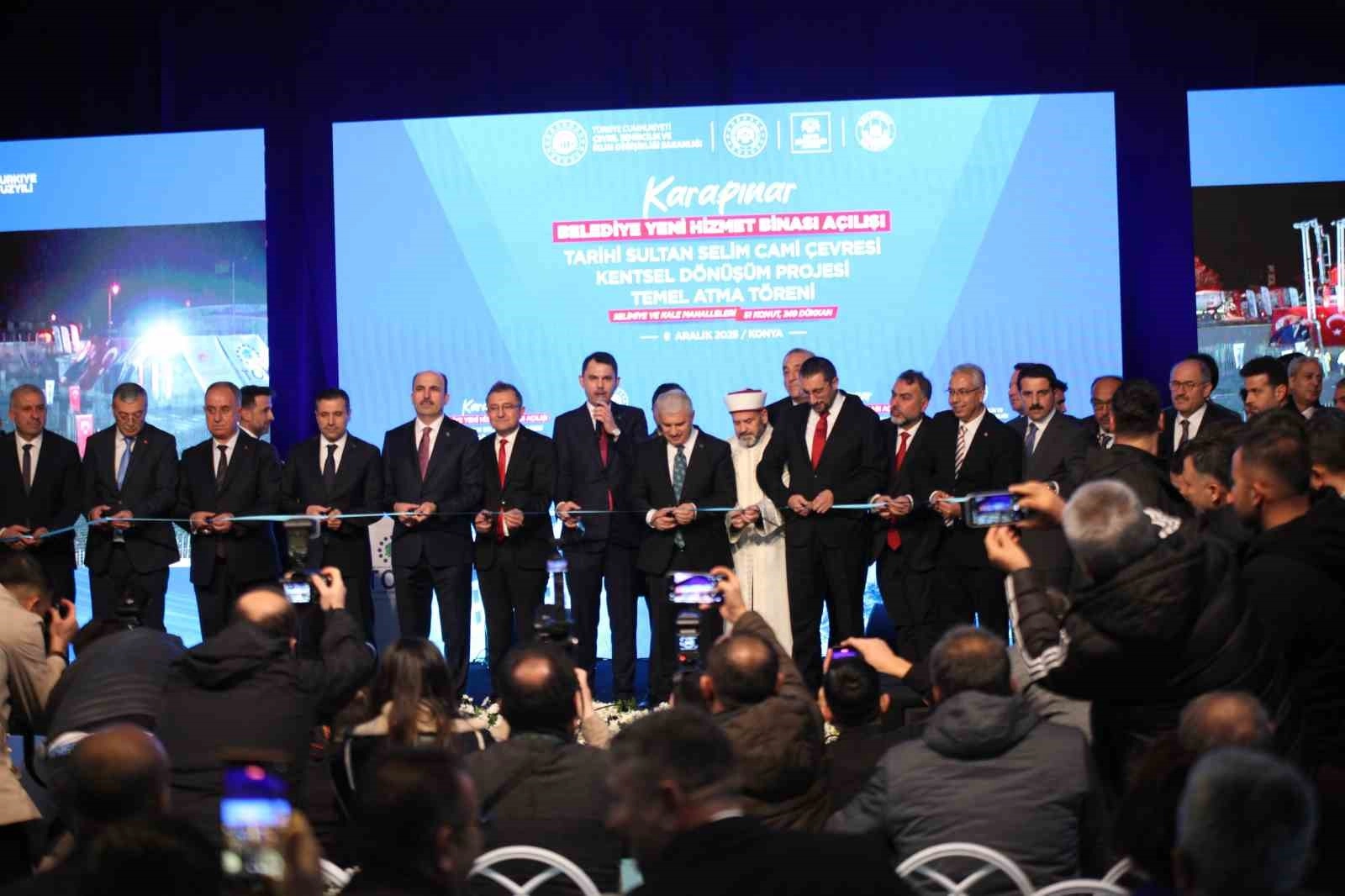 Çeşitli programlara katılmak üzere Konya’ya gelen Çevre, Şehircilik ve İklim Değişikliği Bakanı Murat Kurum, Konya’nın Karapınar ilçesinde Belediye Yeni Hizmet Binası açılışı ve Tarihi Sultan Selim Çevresi Kentsel Dönüşüm Projesi Temel Atma Törenine katıldı. Programda konuşan Bakan Murat Kurum, "Selçuklu’nun emanetini omuzlarında taşıyan Karapınar’ımız ilimle, sporla, güzelliklerle anılsın. Açılışını yapacağımız, temelini atacağımız bu güzel eserlerle hedefimize bir adım daha yaklaşacağız. Hem şehrimizin ihtiyaçlarına cevap verecek hem de hemşehrilerimize daha kaliteli hizmet sunmanın kapılarını açacağız. Açılışını yapacağımız yeni belediye hizmet binamız; teknolojik altyapısıyla, vatandaşlarımızın işlemlerini kolaylaştıran düzenlemeleriyle, personelimizin daha verimli çalışabileceği alanlarıyla ve şık mimarisiyle Karapınar’ımızın geleceğine yakışır bir eser oldu. Bugün ayrıca, çok önemli bir projenin daha başlangıcına hep birlikte şahitlik edeceğiz. Karapınar’ın kimliğini oluşturan Tarihi Sultan Selim Camii Çevresi Projesi’nin de temel atma törenini gerçekleştireceğiz. İnşallah burada da TOKİ’mizle; 51 konut, 249 dükkan, Kur’an Kursu ve kapalı otoparkımızı hızla yapacak ve 2026 yılında sizlere teslim edeceğiz. Camimizin çevresindeki tüm köhneleşmiş yapıları yıkarak, burayı yeni bir meydan olarak tasarlayacağız; böylece hem camimizi ön plana çıkaracak hem de bölgemizi sosyal ve kültürel açıdan daha da canlandıracağız. Karapınar’ın kalbi bu alan hemşehrilerimizin uğrak mekanı olacak" dedi.