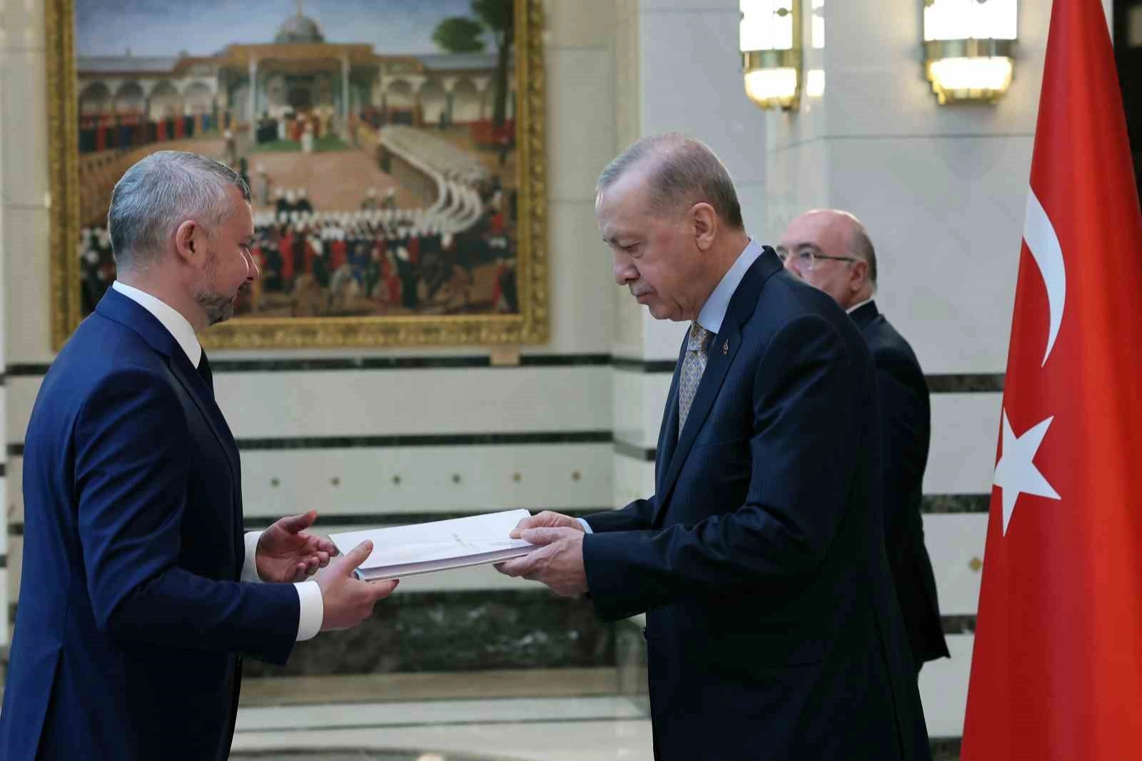 Cumhurbaşkanlığı Külliyesi’ndeki kabulde Belarus Büyükelçisi Anatoly Glaz, Brezilya Büyükelçisi Gilda Motta Santos Neves, Ekvador Büyükelçisi Pedro Vintimilla, Gürcistan Büyükelçisi Archil Kalandia, Vietnam Büyükelçisi Thi Thu Ha Dang Cumhurbaşkanı Erdoğan ‘a güven mektubu sundu.
