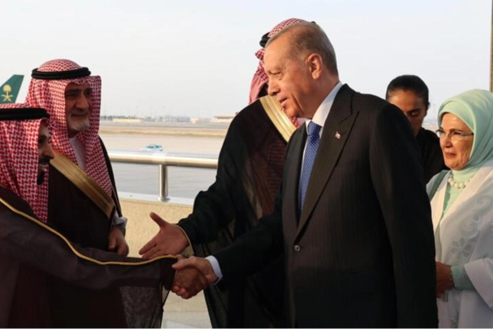 Cumhurbaşkanı Recep Tayyip Erdoğan, Körfez ülkelerine gerçekleştireceği ziyaretler çerçevesinde ilk durağı olan Suudi Arabistan’a geldi. Cumhurbaşkanı Erdoğan’ı taşıyan TC-TRK kuyruk numaralı uçak, TSİ 18.00 sıralarında Cidde Kral Abdulaziz Uluslararası Havalimanı’na indi. Erdoğan, havalimanında Suudi Arabistan Dışişleri Bakanı Faisal bin Farhan Al-Saud, Cidde Belediye Başkanı Saleh Al-Turki ve Mekke Emniyet Müdürü Saleh Al-Jabri tarafından karşılandı. Karşılamada ayrıca Türkiye’nin Riyad Büyükelçisi Fatih Ulusoy, Yemen Büyükelçisi Mustafa Pulat, İslam İşbirliği Teşkilatı (İİT) Daimi Temsilcisi Büyükelçi Mehmet Metin Eker, Cidde Başkonsolosu Mete Zaimoğlu, İİT Genel Sekreter Yardımcısı Musa Kulaklıkaya ve Anıl Çelik Kulaklıkaya, Genelkurmay Başkanlığı Silahlı Kuvvetler Ataşesi Oktay Kayhanlı yer aldı.