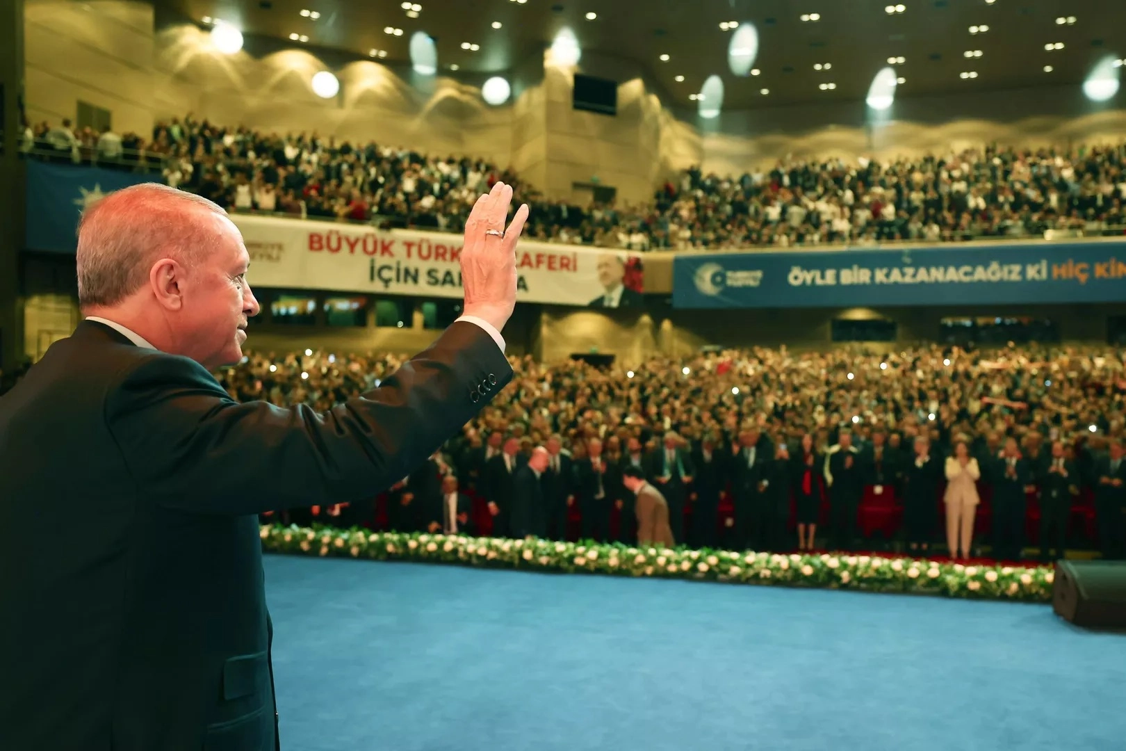 "Sizlerden aldığımız enerjiyle destekle Adıyaman'ıyla Kahramanmaraş'ıyla Hatay'ıyla Gaziantep'iyle Malatya'sıyla Sivas'ıyla deprem bölgesi şehirlerimizi yeniden gezeceğiz." diyen Erdoğan, ülkenin yaşadığı en büyük afet olan 6 Şubat depremlerinden itibaren bölgede olduklarını dile getirdi.
