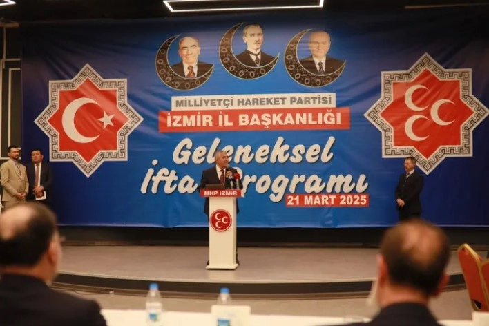 Yaşananlara böyle bakıyoruz. Bizim bu konuda tavrımız nettir; Türk yargısına güvenimiz sonsuzdur. Hiç kimse dokunulmaz, ulaşılmaz ve erişilmez değildir. Hiç kimsenin suç işleme özgürlüğü yoktur. Hiç kimse seçildim diye bu ülkede arsızlık yapma, hırsızlık yapma ve yolsuzluk yapma hakkına sahip değildir" ifadelerini kullandı. MHP İzmir İl Başkanlığının tertip ettiği Geleneksel İftar Programı Cumhur İttifakı buluşmasına sahne oldu. Programda, MHP ve AK Parti milletvekilleri, Belediye Başkanları, üniversitelerin temsilcileri, STK başkan ve temsilcileri, sendikalar ve Ülkü Ocaklılar ile birlikte 2 bin MHP'li yer aldı. MHP İzmir'in İl Yönetim Kurulu üyelerinin, 30 ilçe teşkilatı yöneticilerinin, Belediye Meclis Üyelerinin, Ülkü Ocakları'nın ve Türkiye Kamu Çalışanları Vakfı Şube Başkanlarının tüm kadrolarıyla katıldığı iftar yemeğine AK Parti Genel Sekreteri ve İzmir Milletvekili Eyyüp Kadir İnan, AK Parti İzmir Milletvekili Yaşar Kırkpınar, İl Başkanı Bilal Saygılı, Menemen Belediye Başkanı Aydın Pehlivan da davetliler arasındaydı. MHP İzmir Milletvekili ve Genel Sekreter Yardımcısı Tamer Osmanağaoğlu, MHP'nin üç dönemdir seçim kazandığı Aliağa'da Belediye Başkanlığını yürüten Serkan Acar da programda yerini aldı. MHP İzmir'in Geleneksel İftar Programına EBSO Başkan Vekili Hakan Ürün, Ticaret Borsası Meclis Başkanı Ömer Gökhan Tuncer, Başkan Yardımcısı Ercan Korkmaz, İzmir Esnaf ve Sanatkarlar Odaları Birliği Başkanı Yalçın Ata ve yöneticileri ile birlikte çok sayıda üst düzey protokol katıldı. "Kimsenin suç işleme özgürlüğü yok" İftar programının açılış konuşmasını yapan MHP İzmir İl Başkanı Veysel Şahin, yaşanan İmamoğlu ve İstanbul Büyükşehir Belediyesi soruşturması ile ilgili olarak, "Bizim bu konuda tavrımız nettir; Türk yargısına güvenimiz sonsuzdur. Hiç kimse dokunulmaz, ulaşılmaz ve erişilmez değildir. Hiç kimsenin suç işleme özgürlüğü yoktur. Hiç kimse seçildim diye bu ülkede arsızlık yapma, hırsızlık yapma ve yolsuzluk yapma hakkına sahip değildir" ifadelerini kullandı. "CHP devlet vadetti, ABD özgürlük" MHP İl Başkanı Şahin, "ABD'nin Kürt kardeşlerimizi bizden koparmak için özgürlük vadediyorum dediği ve CHP'li Özgür Özel'in devlet vadediyorum dediği dönemde liderimizin başlattığı, 'Terörsüz Türkiye' projesi kardeşliğimiz ve birliğimiz açısından büyük bir adım olmuştur. Liderimiz Devlet Bahçeli Beyefendi; 'Süreç yok! Müzakere yok! Demokratik dönüşüm yok! Açılım yok! Hapisteki teröristler, Kandil'deki katiller üzerinde oyun kurmak yok! Kayıtsız şartsız örgütün lağvedilmesi, ya silahlar gömülecek ya da silahlarıyla birlikte gömülecek' diyerek sarsılmaz bir irade ortaya koyması büyük Türk Devleti adına büyük bir adım olmuştur" dedi.