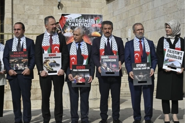 Hasan Turan ve AK Parti'li milletvekillerinin boyunlarına Filistin atkısı taktıkları; "Yüreğimiz yanıyor", "Kudüs Ümmetin Çığlığıdır" yazılı pankartlar ile milletvekillerinin ellerinde Gazze'nin bombalanması sırasında yaralanan çocuklar ve kadınların fotoğraflarının yer aldığı görüldü.