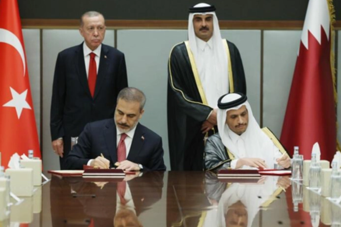Cumhurbaşkanı Recep Tayyip Erdoğan’ın resmi temaslarda bulunmak üzere geldiği Katar’da Türkiye ile Katar arasında diplomatik ilişkilerin kurulmasının 50’nci yıldönümü münasebetiyle ortak bildiri imzalandı. Cumhurbaşkanı Erdoğan ile Katar Emiri Şeyh Tamim bin Hamad Al Sani arasındaki heyetlerarası görüşmenin başında imzalanan bildiriye Türkiye adına Dışişleri Bakanı Hakan Fidan, Katar adına ise Katar Başbakanı ve Dışişleri Bakanı Ekselansları Şeyh Muhammed bin Abdulrahman bin Jassim Al Sani imza attı.