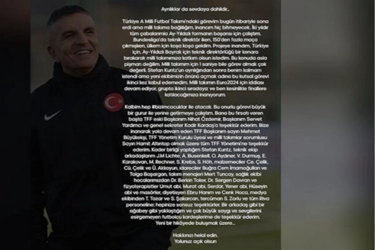 Türkiye A Milli Futbol Takımı'ndaki görevim bugün itibariyle sona erdi ama milli takıma bağlılığım, inancım hiç bitmeyecek. 2 yıldır tüm çabalarımla Ay-Yıldızlı formanın başarısı için çalıştım. Bundesliga'da teknik direktör iken, 150'den fazla maça çıkmışken, ülkem için koşa koşa geldim. Projeye inandım ve Türkiye için, Ay-Yıldızlı Bayrak için teknik direktörlüğü bir kenara bırakarak milli takımımıza katkım olsun istedim. Bu konuda asla pişman değilim. Milli takımım için 1 saniye bile görev almak çok değerli. Stefan Kuntz'un ayrılığından sonra benim kalmam istendi ama yeni teknik adamın önünü açmak adına bu kutsal görevi ikinci kez kabul edemedim. Milli takımın Euro2024 için iddiası devam ediyor, grupta ikinci sıradayız ve ben kesinlikle finallere katılacağımıza inanıyorum.