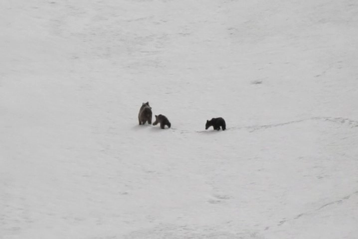 Karla kaplı dağın yamacında büyükçe iki ayının birbiriyle adeta güreşmesi ve bir anne ayının iki yavrusuyla yiyecek araması görüntülerde yer aldı.