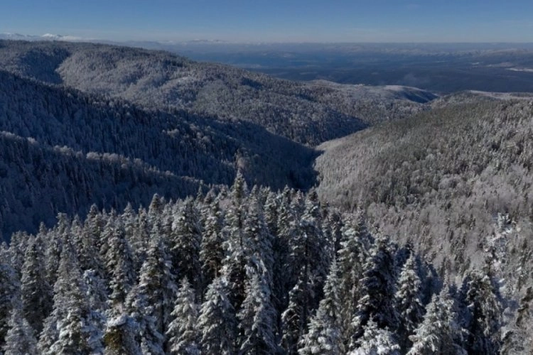 Bolu'da geçtiğimiz hafta yüksek rakımlı mevkilerde kar yağışı etkili oldu. Kar yağışı Mengen ilçesinin yüksek kesimleri beyaz örtüyle kaplandı. Karlar içerisinde kalan çam ağaçları havadan görüntülendi.