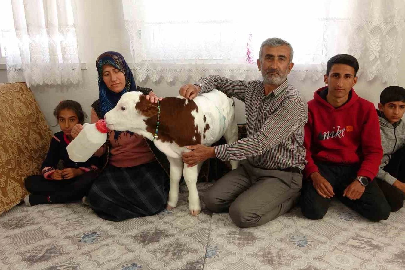 Adıyaman’ın Şerefli Köyü’nde 35 yıldır hayvancılıkla uğraşan 3 çocuk annesi Birgül Coşkun ve Mehmet Coşkun’un ahırda besledikleri ineği erken doğum yaptı. 8 ay 10 günlük olarak doğum yapan ineğin buzağısı halsiz ve bitkin bir şekilde hayata gözlerini açtı. Ölmek üzere olan buzağının annesini emmediğini ve ineğin de oldukça üzüldüğünü fark eden Coşkun Çifti, buzağıyı yaşadıkları eve çıkararak odada beslemeye başladı. Hasta beziyle buzağının altını bağlayan, biberonla karnını doyurmaya çalışan Coşkun Çifti, buzağıyla aynı odada yaşam sürmeye başladı. Buzağıyla 11 gündür ayı odada yaşayan Coşkun ailesi, buzağıya gözleri gibi bakıyor.