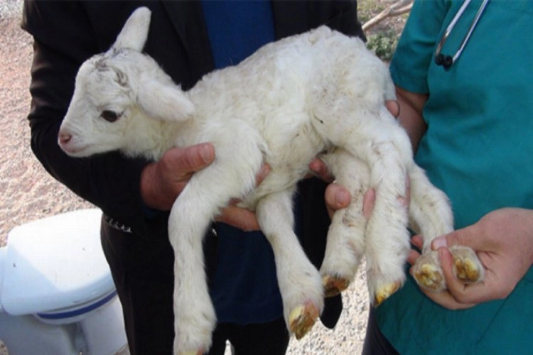 Alışılmışın dışında arka bacaklarının arasında diğerlerine göre aynı birbirine bitişik iki bacağı daha olan kuzu görenleri hayrete düşürüyor. Bacaklardan ikisinin birbirine bitişik olması nedeniyle 6 bacaklı gibi görünen kuzunun yürümekte güçlük çektiği de görüldü.