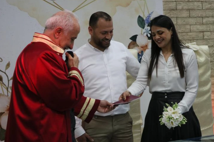 Hatay'ın Defne ilçesindeki depremin ardından Mersin'e giden 25 yaşındaki Seda Randa ve 34 yaşındaki Gökhan Bilgiç, hüzünlü nikah töreniyle evlendi.