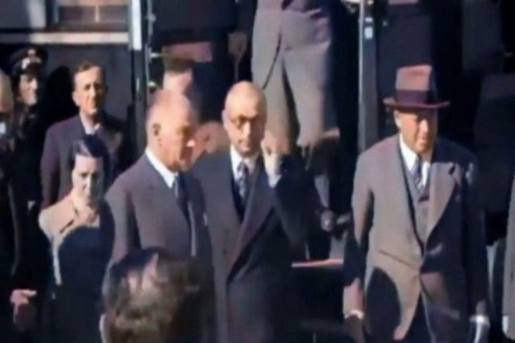 Görüntülerde Atatürk ile Celal Bayar'ın ilk kez birlikte ziyaret gerçekleştirdikleri görülüyor. Heyet halinde trenden inen Atatürk ve arkadaşları için karşılama töreni düzenlendiği videoda dikkat çeken bir diğer detay.