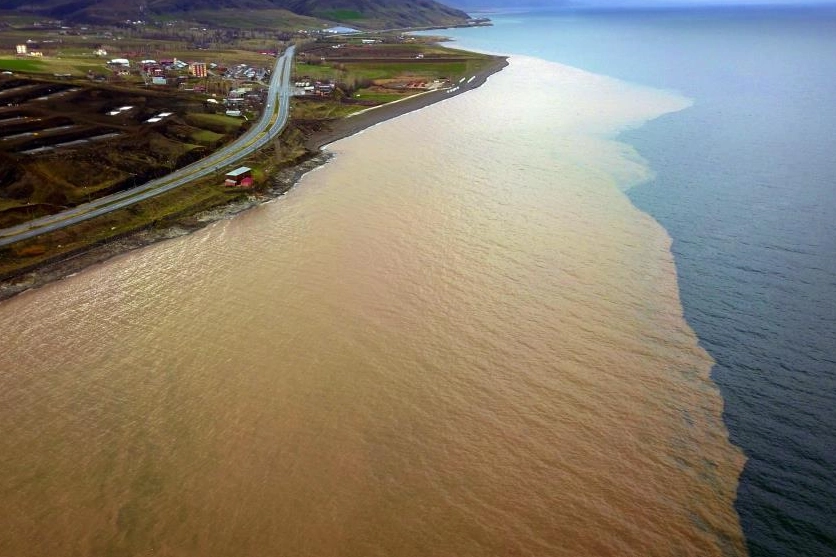 Meteorolojinin yaptığı uyarının ardından Bitlis’in Ahlat ilçesinde sabah saatlerinden itibaren şiddetli yağış etkili oldu. Yağış sonrası dere yataklarında oluşan sel suları Van Gölü’ne döküldü. İlçenin Ahlat-Adilcevaz yolu üzerindeki 10 kilometrelik hat göle dökülen sel suları sonrası kahverengiye boyanırken, ortaya çıkan görüntü ise havadan görüntülendi. Öte yandan, karayolunu kullanan sürücüler ise sel suları ve masmavi Van Gölü suyunun oluşturduğu görüntü karşısında şaşırdı.