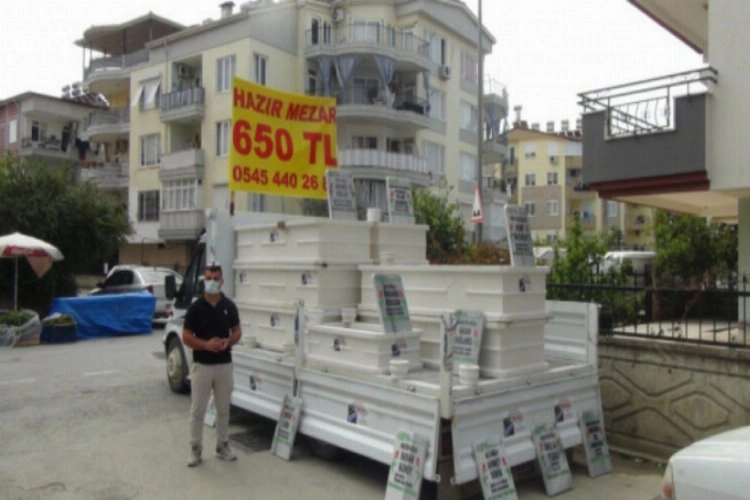 Antalya'nın Manavgat ilçesinde salı pazarına gelen vatandaşlar, pazarın girişinde konuşlanan ve üzerinde hazır mezar bulunan kamyoneti görünce şaşkınlık yaşıyor. Korona virüsten dolayı vatandaşın ayağına mezar götürdüklerini söyleyen mezar imalathanesi temsilcisi Ali Serter, "Korona virüs tedbirleri kapsamında vatandaşlar sokağa çıkmakta zorlanıyor. Bu durumu dikkate alarak hizmetlerimizi vatandaşımızın ayağına getirelim istedik" dedi.