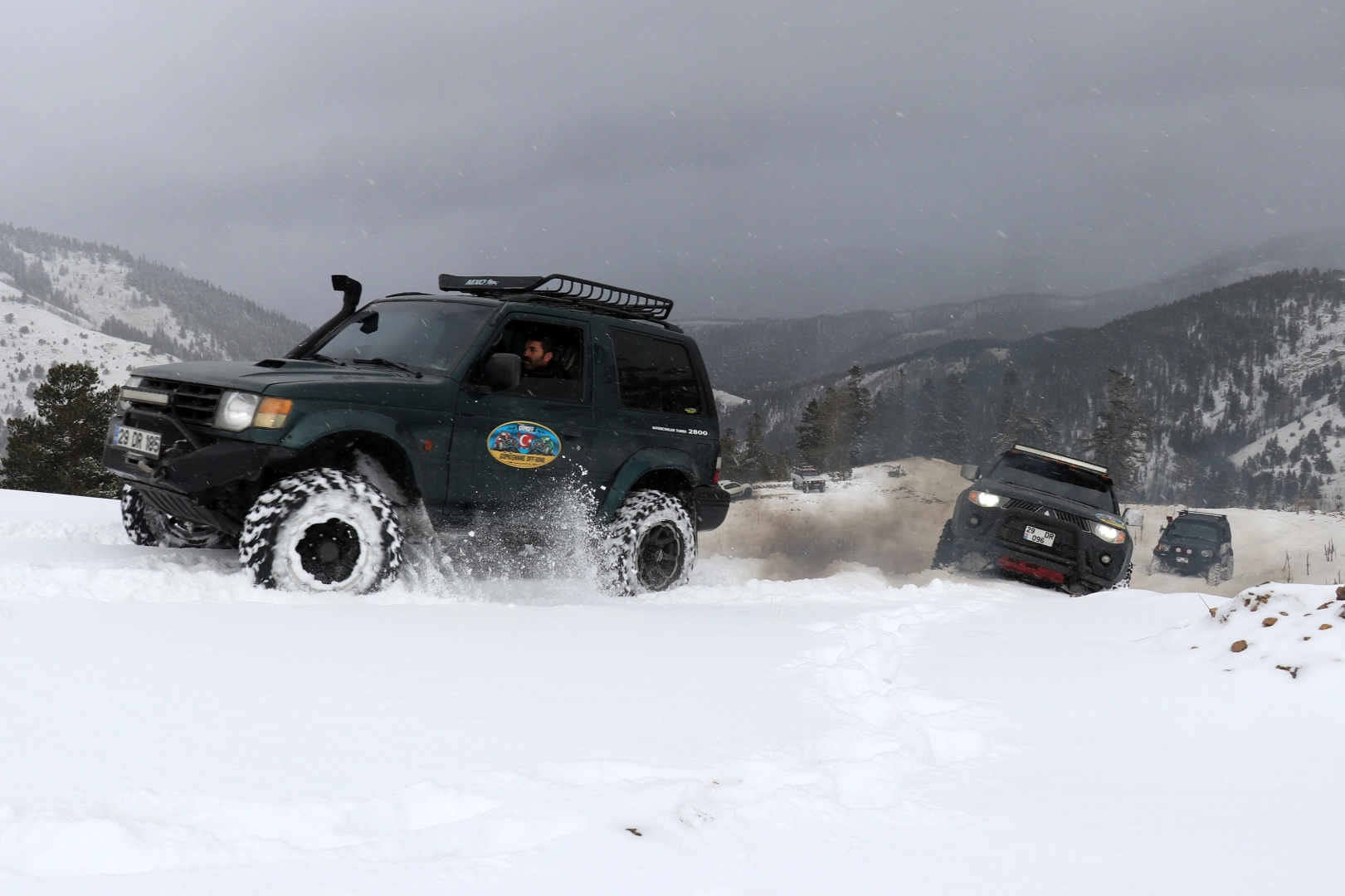 Torul ilçesine bağlı Kocadal köyünden Tersun Dağı zirvelerine orman içinde karlı kaplı yolları aşarak giden sporcular zaman zaman arızalanan araçlarını kendi imkanlarıyla yaparak yollarına devam etti.