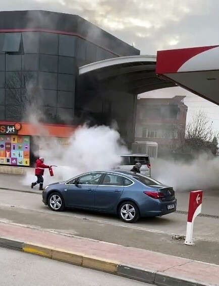 Görüntülerde, akaryakıt istasyonunda dumanlar yükselen araca görevlinin müdahale edişi yer aldı. Sonrasında ise araç istasyondan uzaklaştırıldı.