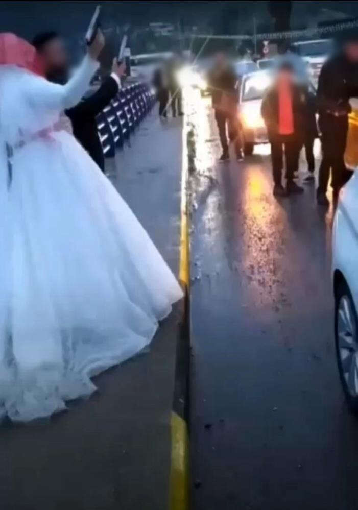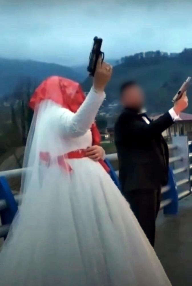 Bir köprünün üzerinde duran gelin ve damat ellerine aldıkları tabancalar ile havaya peş peşe ateş açtı.
