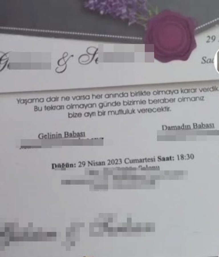 Öte yandan, düğün davetiyesinde, "Yaşama dair ne varsa her anında birlikte olmaya karar verdik. Bu tekrarı olmayan günde bizimle beraber olmanız bize ayrı bir mutluluk verecektir" yazısı dikkat çekti. Bir süre düğün salonunda kalan davetliler ise durumu öğrendikten sonra salondan ayrıldı.