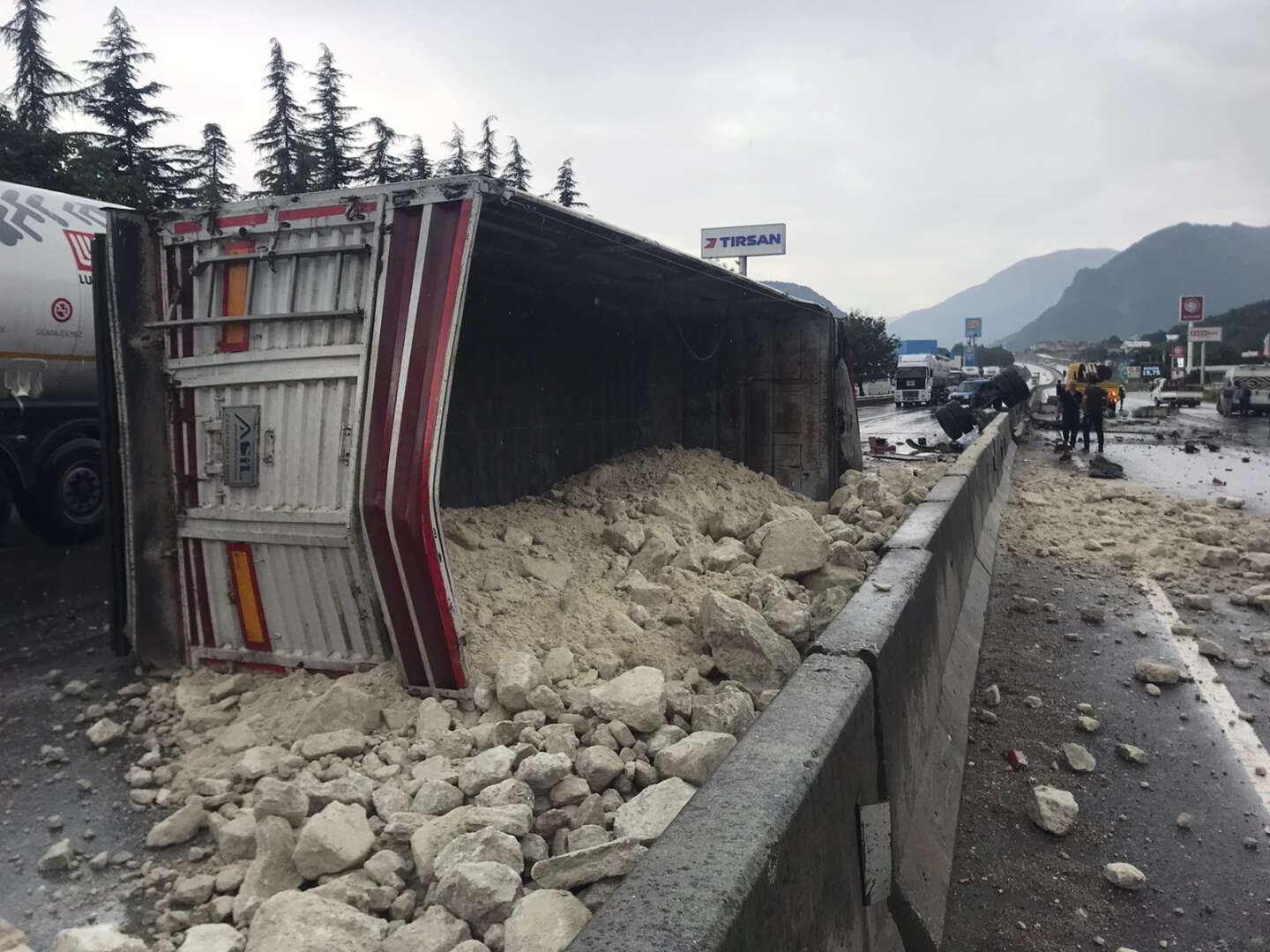 Devrilen kamyonda yüklü olan malzemeler yola saçılırken, sürücü yaralandı. Kazanın ardından devrilen kamyona çarpmamak için manevra yapan 47 PY 502 plakalı tır ise yol kenarında bulunan akaryakıt istasyonuna daldı. Kazada tırda ve akaryakıt istasyonunda maddi hasar meydana geldi.