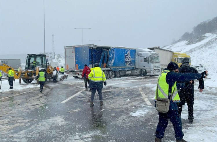 Kuzey Marmara Otoyolu'nda 5 tır, 2 yolcu otobüsü ve kar küreme aracının karıştığı zincirleme kaza meydana geldi. 3 kişinin yaralandığı kaza nedeniyle bölgede trafik yoğunluğu oluştu.