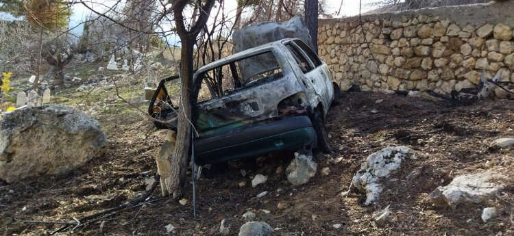 Karaman’ın Ermenek ilçesinde kontrolden çıkarak mezarlığa uçan otomobil yanarak demir yığınına döndü.