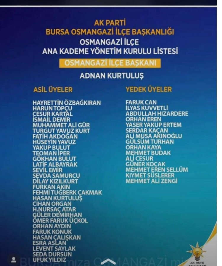 Osmangazi İlçe Başkanı Adnan Kurtulmuş yönetimindeki Osmangazi İlçe ana kademe yönetim kurulu listesi şöyle;