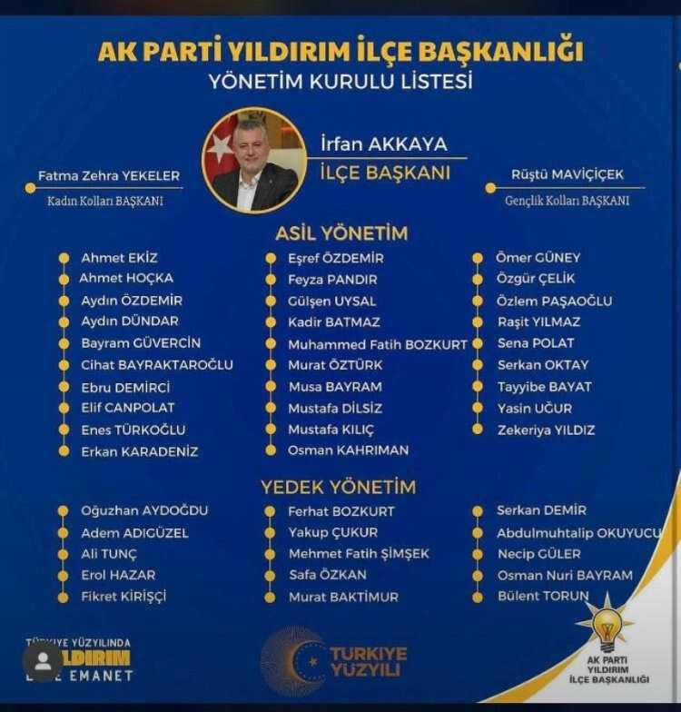 Yıldırım İlçe Başkanı İrfan Akkaya yönetimindeki Yıldırım İlçe yönetim kurulu listesi şöyle;