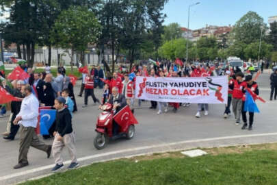 İnegöl Belediyesi eski binası önünde toplanan binlerce kişi "Filistin Yahudi'ye mezar olacak" yazılı dev pankartla Atatürk bulvarı üzerinden Atatürk heykeline kadar yürüdü.