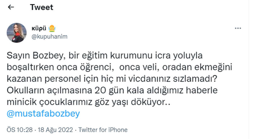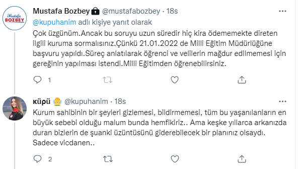 Sosyal medyaya yansıyan krizin ardından Twitter’da Küpühanım rumuzlu kullanıcının “Sayın Bozbey, bir eğitim kurumunu icra yoluyla boşaltırken onca öğrenci, onca veli, oradan ekmeğini kazanan personel için hiç mi vicdanınız sızlamadı? Okulların açılmasına 20 gün kala aldığımız haberle minicik çocuklarımız göz yaşı döküyor..” sözleri ile olay kamuoyu gündemine taşındı. Tepkilerin yükselmesi üzerine küpühanım rumuzuna yanıt veren Mustafa Bozbey, “Çok üzgünüm. Ancak bu soruyu uzun süredir hiç kira ödememekte direten ilgili kuruma sormalısınız. Çünkü 21.01.2022 de Milli Eğitim Müdürlüğü’ne başvuru yapıldı. Süreç anlatılarak öğrenci ve velilerin mağdur edilmemesi için gereğinin yapılması istendi. Milli Eğitim’den öğrenebilirsiniz.” İfadelerini kullandı.