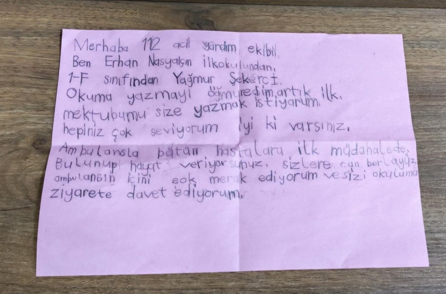 Bursa'da yaşayan Erhan Nasyalçın İlkokulu 1. sınıf öğrencisi Yağmur Şekerci, çok merak ettiği ambulansı yakından görmek için Bursa 112 Ambulans Başhekimliği'ne hitaben bir mektup yazdı. Mektubunda en büyük isteğinin okuluna bir ambulans gelmesi olduğunu belirten Yağmur'un bu isteği, 112 tarafından gerçekleştirilince oldukça güzel görüntüler ortaya çıktı.