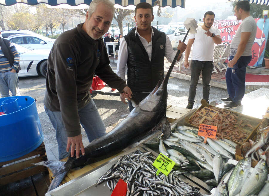 Marmara denizinde balıkçılar tarafından yakalanan kılıç balığının kilosu 100 liradan satıldı.