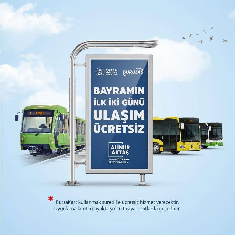Bursa Büyükşehir Belediye Başkanı Alinur Aktaş sosyal medya hesabından yaptığı paylaşımda, "Hemşehrilerimiz sevdiklerine rahatça ulaşabilsin diye Kurban Bayramı’nın ilk iki günü ulaşım ücretsiz.. 'BursaİçinCanlaBaşla' diyerek paylaştığı bildirimde BursaKart kullanmak suretiyle ücretsiz hizmet verecektir' ve 'Uygulamanın kent içi ayakta yolcu taşıyan hatlarda geçerlidir' ifadelerine yer verdi.