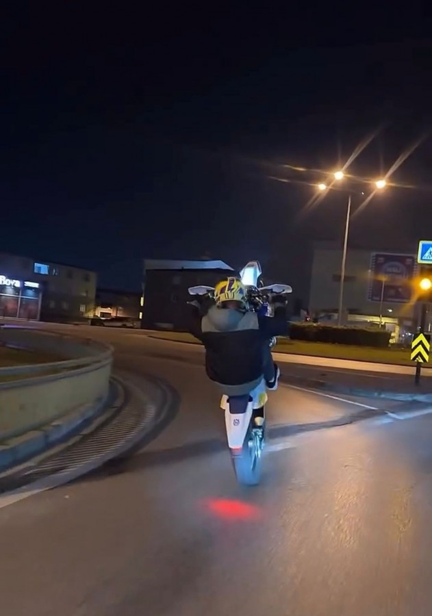 Yıldırım ilçesinde gece saatlerinde bir motosikletli, önce plakasız aracıyla tek teker üzerinde ilerleyerek trafiği tehlikeye attı. Motosikletli daha sonra aracı ile kaldırıma çıkıp, akrobasi hareketleri yaptı. O anlar, başka bir sürücü tarafından cep telefonuyla görüntülenirken; polis ekipleri, sürücüyü yakalamak için çalışma başlattı.
